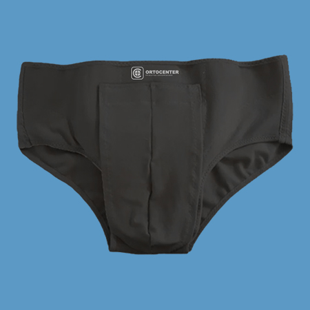 Confeccionada em cóton, pelotas de borracha para apoio da hérnia.